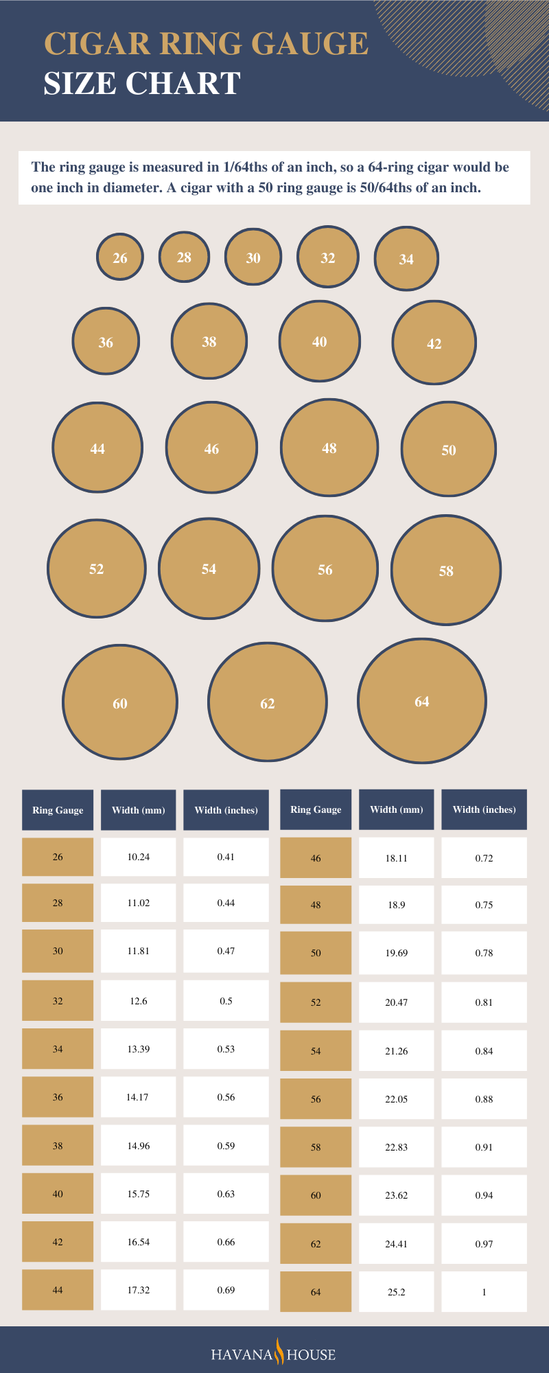Cigar size is determined by its length and its diameter. The diameter of the cigar is described by its ring gauge, which is measured in 1/64 inch. So, for example, a cigar with a ring gauge of 32 will be measured 32/64. In other words, that cigar would have a diameter of half an inch.