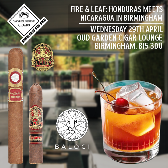 After our first Birmingham event sold out in just one week, we’re back with the highly anticipated second edition, Fire & Leaf: Honduras Meets Nicaragua. Join us on Wednesday, 29th April at the stunning Cigar Lounge at the Baloci Hotel…