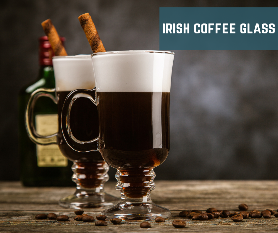 The Irish Coffee glass is a fairly self-explanatory glass. This glass is a handled mug that is used to create Irish coffee. Irish coffee is a cocktail of hot coffee, Irish whiskey and sugar, topped with cream.