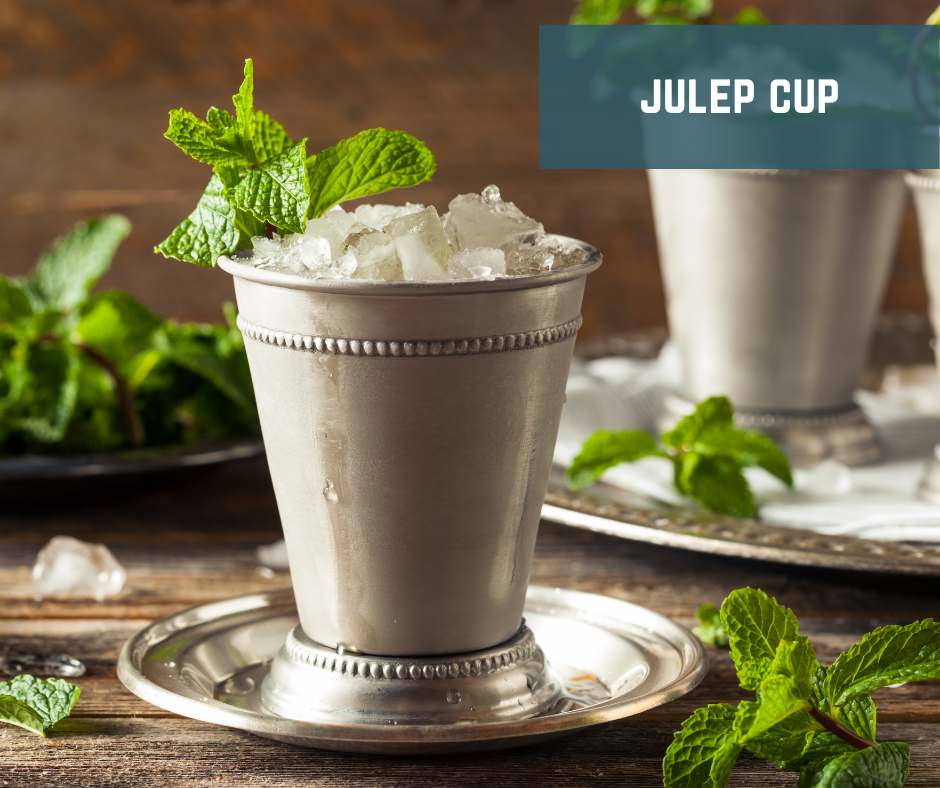 The julep cup is used to create mint julep cocktails. Mint julep is a cocktail consisting of Bourbon, sugar syrup and mint poured over crushed ice.