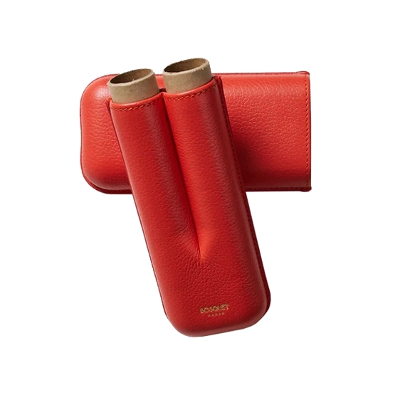 The Bosquet Paris Light Red Grained Calf Leather Cigar Case – 2 Cigars is a luxurious French accessory, meticulously handcrafted for discerning cigar enthusiasts. Made from premium grained calf leather in a vibrant light red finish, it combines elegance with durability. The interior features vegetable-tanned leather, providing a protective and breathable environment for up to two cigars of 60 ring gauge. Its five-ply construction ensures structural integrity, while minimal visible stitching maintains a clean, refined appearance. Embellished with a subtle 22-carat gold Bosquet Paris signature, this compact case blends style, practicality, and artisanal craftsmanship, making it an ideal companion for travel or display.