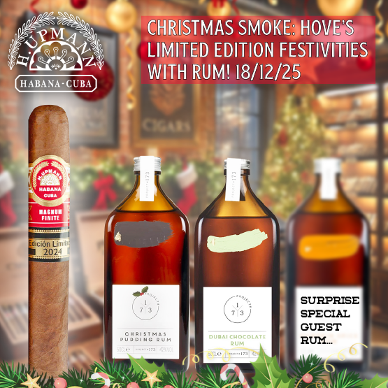Celebrate the season in style at “Christmas Smoke: Hove’s Limited Edition Festivities with Rum” on Thursday, 18th December at our Cigar Lounge in Hove! Enjoy a magnificent Cuban Limited Edition cigar released this year, perfectly paired with three experimental rums from Project 173. Indulge in festive mince pies and a delicious cheese board. This exclusive, ticket-only event promises holiday cheer, luxury, and unforgettable flavours. Secure your spot for an extraordinary Christmas celebration!