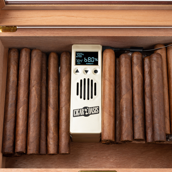 Designed for 100-300 cigar humidors (up to 4 cubic feet) The Cigar Oasis Excel 3.0 is a small humidifier that is fully automatic. Just plug it in using a paper thin power cord and it’s ready to go. The large LCD displays the humidity and temperature in the humidor and displays the current set point. The unit comes with a refillable, replaceable water cartridge that uses distilled water only. The Cigar Oasis Excel 3.0 has a built in system, which accurately monitors the humidity and uses a quiet fan to filter and circulate the air in the humidor eliminating “musty” odors so common in well-sealed humidors. The Cigar Oasis Excel 3.0 now has built-in Smart Humidor Wi-Fi which allows users to adjust and monitor humidity remotely from any iOS or Android smart device with a subscription.