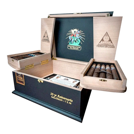 Celebrating a decade of excellence, Foundation Cigar Company introduces its 10-Year Aniversario, a Salomon vitola expertly crafted to honor ten years of artistry and passion. Measuring 7 × 58 in a double-tapered Salomon style, this limited-edition cigar features a hybrid wrapper blending Connecticut Broadleaf and Connecticut Havana Seed tobaccos grown in the Connecticut River Valley. The binder is a rich Mata Fina from Brazil, while the filler blend combines premium Nicaraguan leaves from Estelí, Jalapa, and Condega, all cultivated by A.J. Fernández.