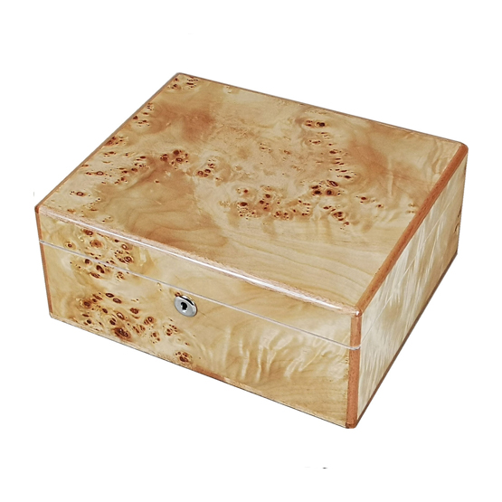 This 25 cigar humidor is made from the finest natural Maple Burl wood veneer. It has 15 coats of lacquer giving it a high gloss finish. The interior is lined in cedar. It is fitted with a Hillwood chrome hygrometer and humidifier system for perfect cigar storage. It has a removable divider to keep cigars separate and accommodate different sizes as well as a key lock to keep it closed and secure. The base is fitted with a removable wood and brass mesh frame to enable uniform airflow around the cigars in the bottom of the box. Brand new and in a gift presentation box this humidor will be great for personal use or as a gift.
