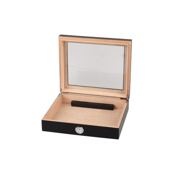 nThe Matte Black Humidor with Glass Top for 20 cigars is tremendous value for money. Great for beginners. Includes an external hygrometer and internal humidifier. To maintain the proper humidity in your humidor, use a few drops of PG Solution and fully charge the humidification unit. For different temperatures and extended storage, it may be advisable to recharge the humidification unit as needed, but this will depend on number of cigars, humidity, temperature and cigar freshness.