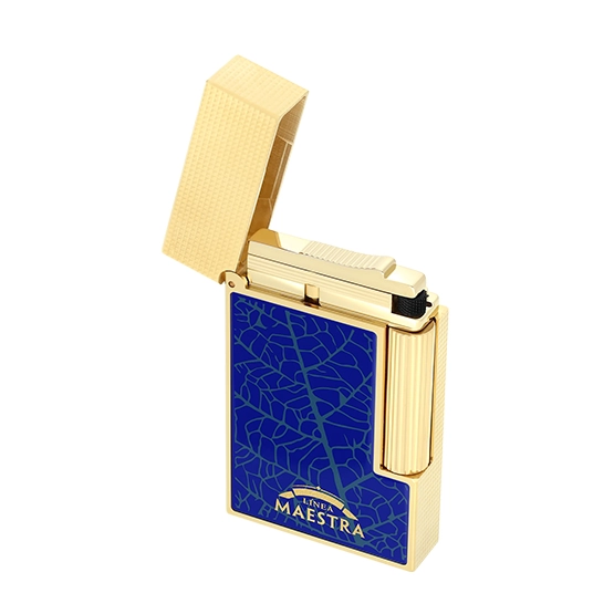 Partagás and S.T. Dupont unite in a refined collaboration inspired by the Línea Maestra cigar. This elegant collection features tobacco leaf motifs, the iconic Partagás factory, and the signature blue of the new line. The Line 2 lighter is finished in glossy dark blue lacquer, engraved with the Línea Maestra logo on the front and the factory design on the back. Blending tradition with modern design, it offers a timeless experience with a soft, adjustable double flame.