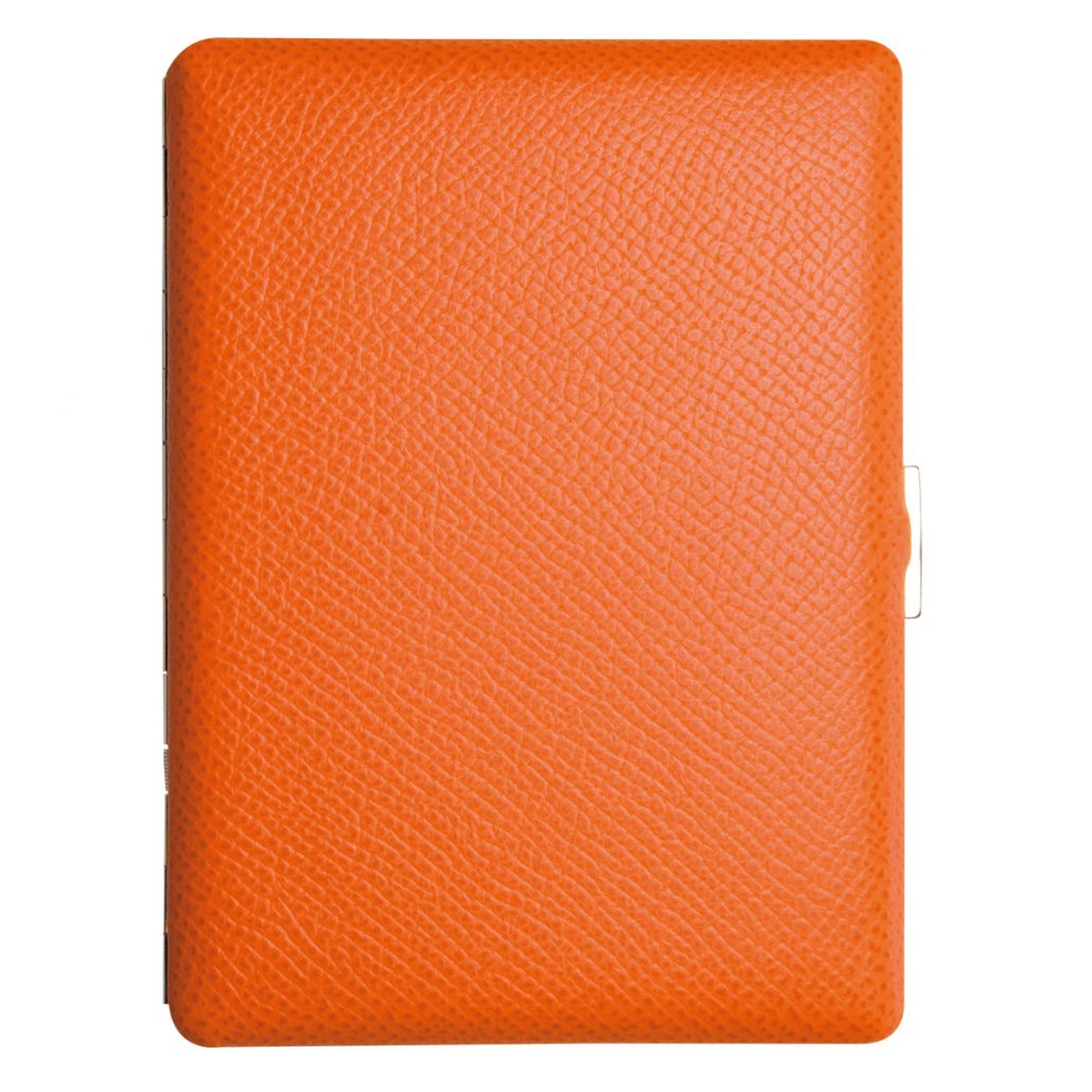 This elegant cigarette case from Tsubota Pearl can hold 9 superking cigarettes, or 12 regular cigarettes. These fine cigarette cases are made in Japan using Noblesse calf leather and brass. The case measures 103 x 78 x 12 mm. The Cosmos Cigarette Case is also available at Havana House in black, orange and red.