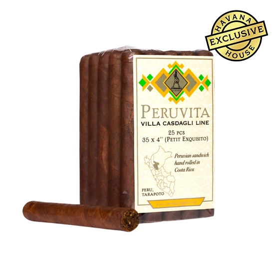 The Villa Casdagli Peruvita Petit Exquisitos Cigar is a refined and luxurious small-format cigar that showcases exceptional craftsmanship and a rich blend of flavors. Measuring 4 inches with a 36-ring gauge, this Petit Exquisitos-sized cigar is designed for smokers who appreciate a complex and flavorful experience in a shorter smoking session.
