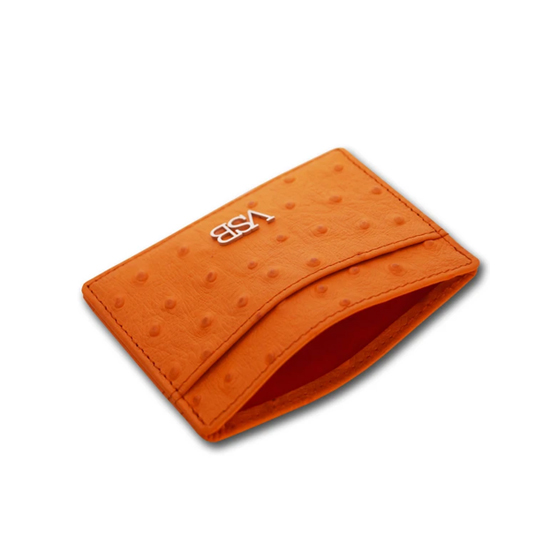 Simple and stylish premium ostrich skin card holder, Slim and compact design. Contains one card pocket on the front and two pockets on the back. Includes a highly wear resistant velvet central pocket ideal for coins.