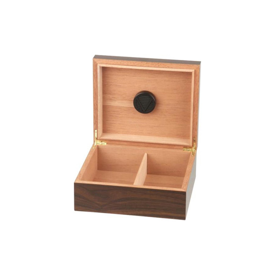 This great value walnut cigar humidor will hold at least 25 cigars, cedar lined with an acrylic polymer (gel)humidifier and hygrometer (not shown).