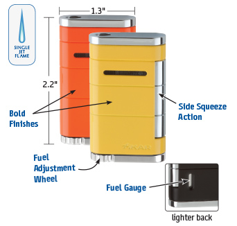 Equipped with a powerful single jet flame, the Allume ensures efficient lighting of cigars, while its wind-resistant design guarantees reliable performance in various conditions. The side-squeeze ignition mechanism offers intuitive operation, and the built-in fuel window allows users to monitor butane levels easily, preventing unexpected refills.