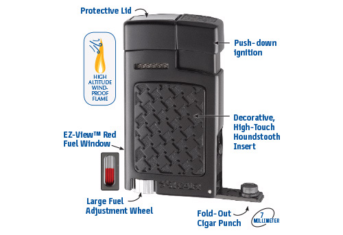 The versatile Forte from XIKAR now available in a soft flame. The new Xikar Forte Soft Flame Cigar Lighter is engineered from the inside out, the lighter’s interior mechanics offer the latest technology in performance engineering, and the Houndstooth patterned metal inserts provide a classic outer look. The all metal body features a built-in razor sharp 7mm cigar punch so you can always be prepared when the moment calls for a cigar. Enjoy the celebration, it’s good for life.