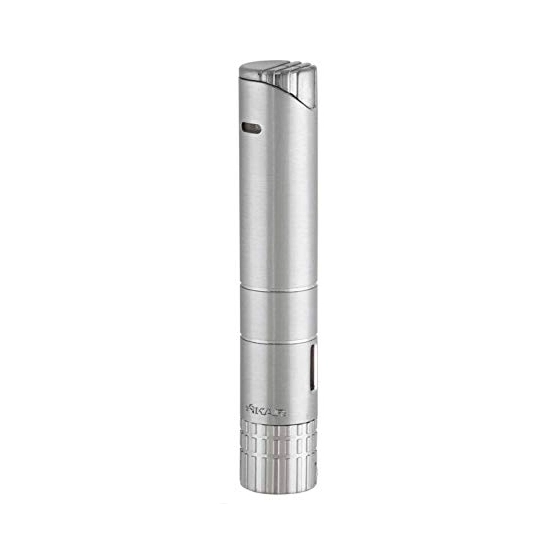 Building on the success of the Turrim 5×64, the Xikar Turrim Single Lighter Silver slims things down with a smaller 4.5 (inch) x 50 (cigar ring gauge) that will fit easily in most Robusto size or larger cigar cases. One press of the ergonomic pull-down ignition system ignites a high-powered single jet flame. An innovative ratcheting flame adjuster makes it easier than ever before to adjust the flame to your liking. An extra-large fuel tank makes for fewer fill-ups, while a convenient fuel level window lets you double-check butane levels with ease.