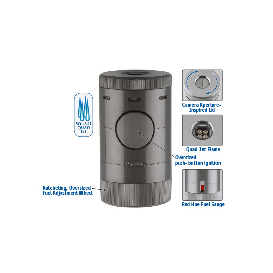 The Volta bundles XIKAR’s patented technologies to deliver a high performance quad flame tabletop lighter. The oversized push button ignition fits flush against the cylindrical metal body creating a powerful appearance. The high tech camera aperture-inspired lid protects the quad burners, keeping debris out with a quick twist of the top lid.