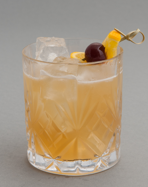 3) Strain into a glass and garnish with the cherry and lemon wedge.